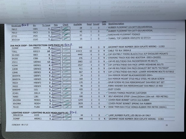 Delivery day for me was always going to be about discovery; discovery of what I have (and what I don’t have), where it is and where I am going to store it. The best source of this information is provided by Caterham in the “Pick List Report”. My report was 21 pages long, and – after taking a copy – the rest of the day my wife and I worked through this report, finding the parts, ticking them off (or listing them as missing) and recording any observations. Reading this report isn’t easy, because it lists all parts used to build the car, even if they are already fitted to the chassis or engine. It helps to use the listed part number to lookup an image of the part on the Caterham Parts website (https://caterhamparts.co.uk) when the description is a bit cryptic.