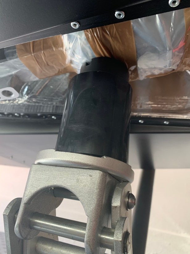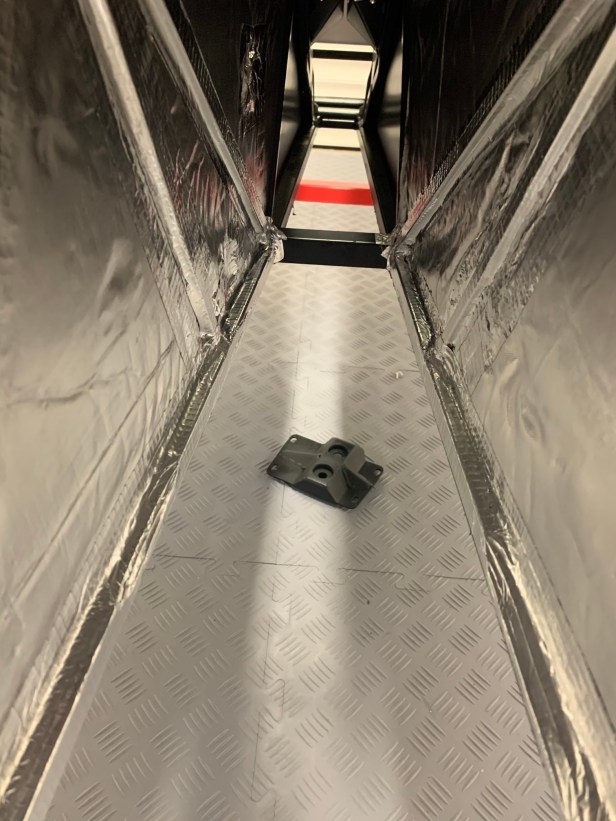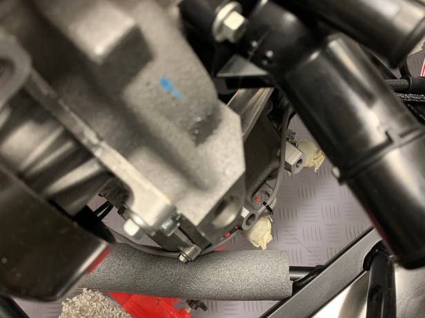 To be able to fit the gearbox mount to the chassis, you will need to clear the holes from the heat-shield tape; I used a pick to do this. Fit the gearbox mount loosely. I have read other blogs, where the IVA inspector wanted the bolt downwards to make observing the thread through the nyloc nut easier. It makes no difference to me up- or downwards, but I suspect downwards is a bit more fiddly to install. I decided to fit the bolt downwards just in case, but it would be a simple job to change this at a later time.
