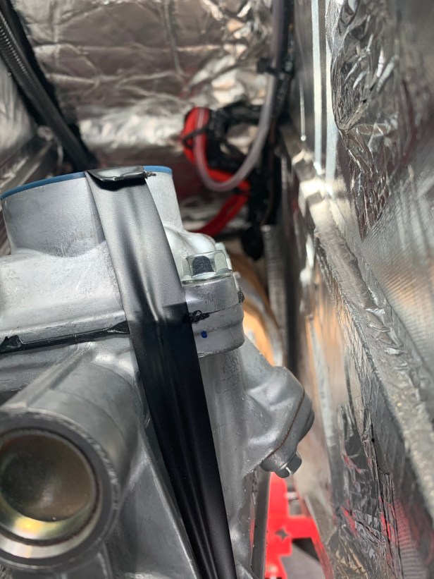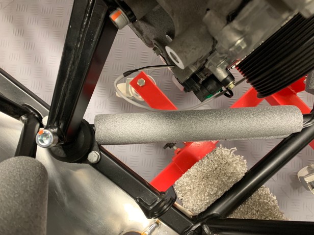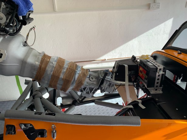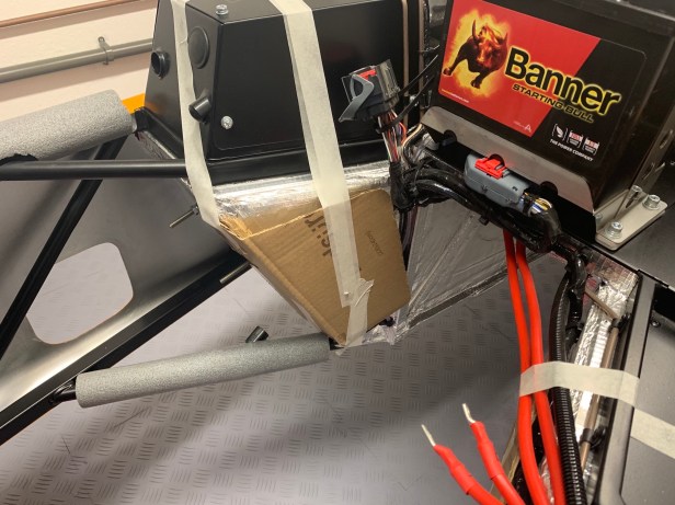 My engine install actually started with more preparation: covering the chassis tubes with pipe lagging and cutting strong cardboard for the footwell heat-shielding.