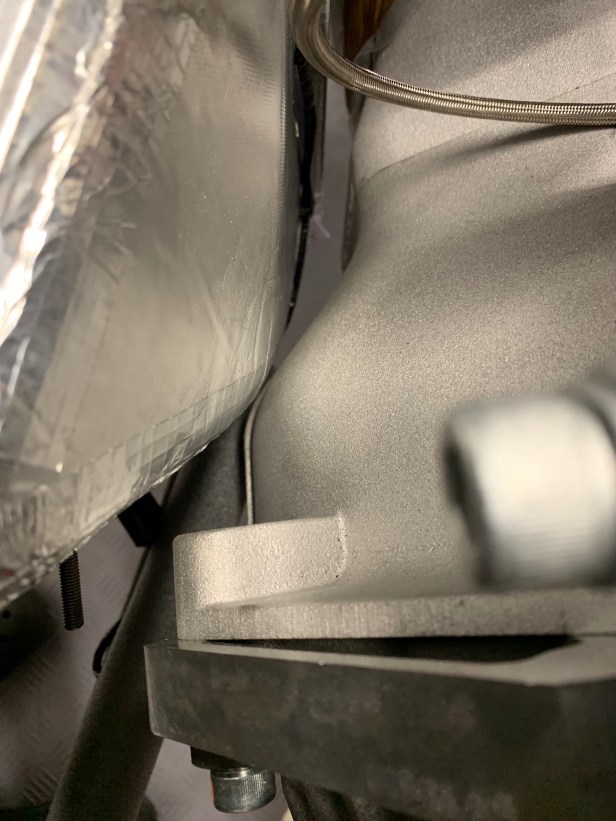 Remember, it gets very tight in places. I have taken some photos of the engine as it squeezes past the pipe lagging. Without the protective lagging the chassis would be damaged. From the photos you can see how the cardboard saved the heat-shield from damage.