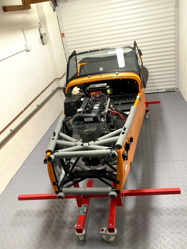 It’s not possible to install an engine into a Caterham in my garage without either the engine hoist or the chassis beginning the process being outside – my garage just isn’t long enough. To make matters worse, my garage is also on a slope, so I chose to start with the chassis outside. Pushing the chassis uphill is easier at this stage, because it’s lighter than the engine and gearbox. Thankfully the weather was perfect for the install.