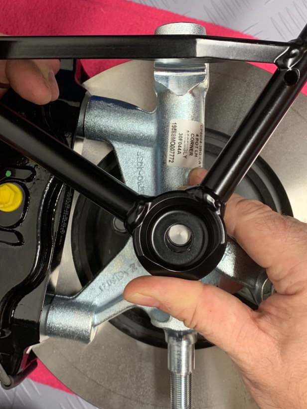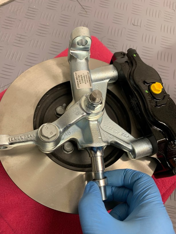 I removed the nuts from the track rod and upper wishbone ball joint and also took off the plastic cover from the track rod ball joint, before the top hat came out of the freezer. The final bit of preparation was to slide the thin spacer onto the upright. It only wants to go one way, so don’t force it.