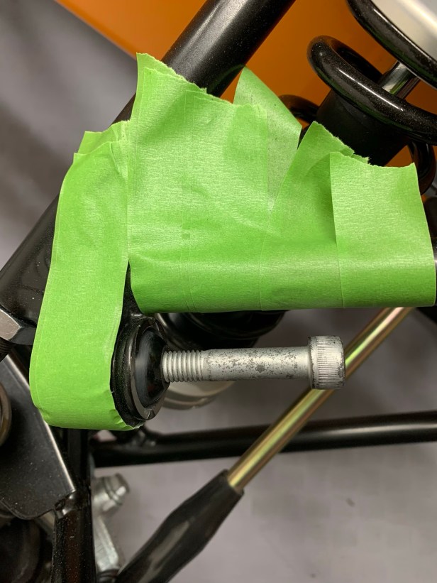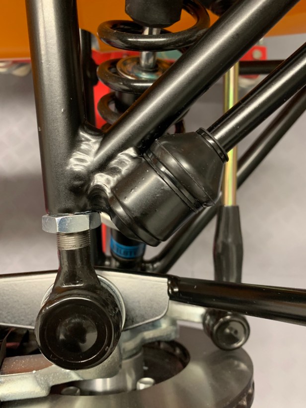 I put the ARB ball onto a spare bolt so it’s easier to test the fit with the front upper wishbone – as expected it didn’t. Like my previous 360R build, I needed to remove the burs from the ARB balls and clean the powder coat from the upper wishbone ARB ball cup. With the ball on the bolt, a bit 600 grit wet-and-dry sand paper removed the minor burrs.