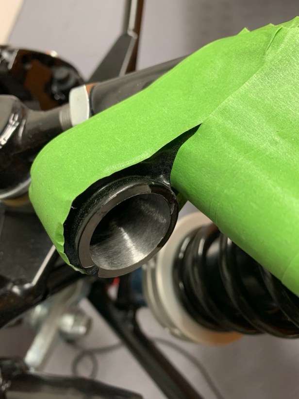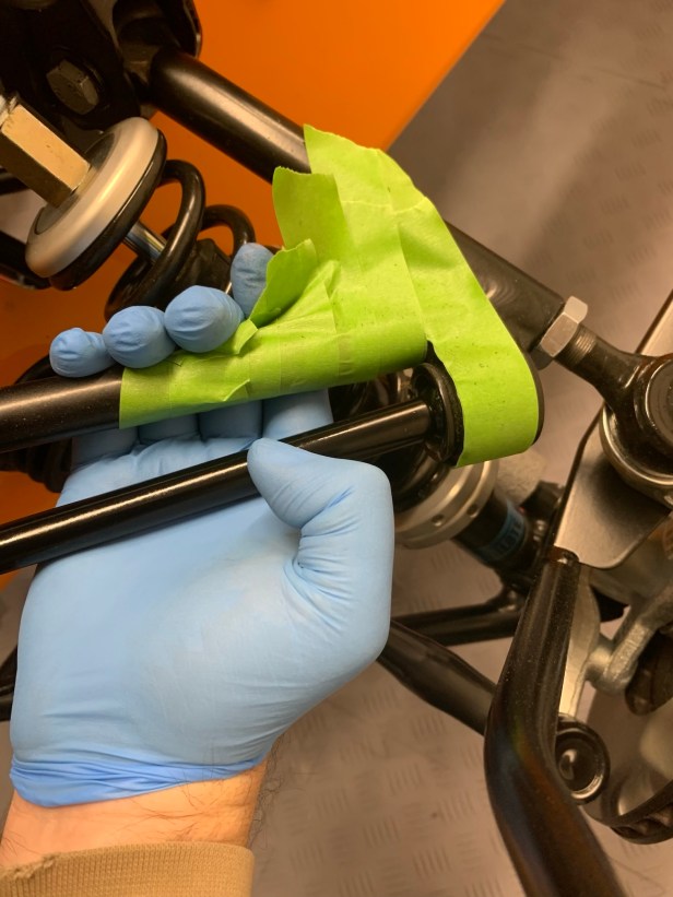Next, I protected the the wishbone, because I used my Dremel with a sanding band to clean the powder coat from the ARB ball cup. I did this little by little until the ball just fitted into the wishbone. Don’t go too far and make the ball loose in the cup, it wants to be tight.