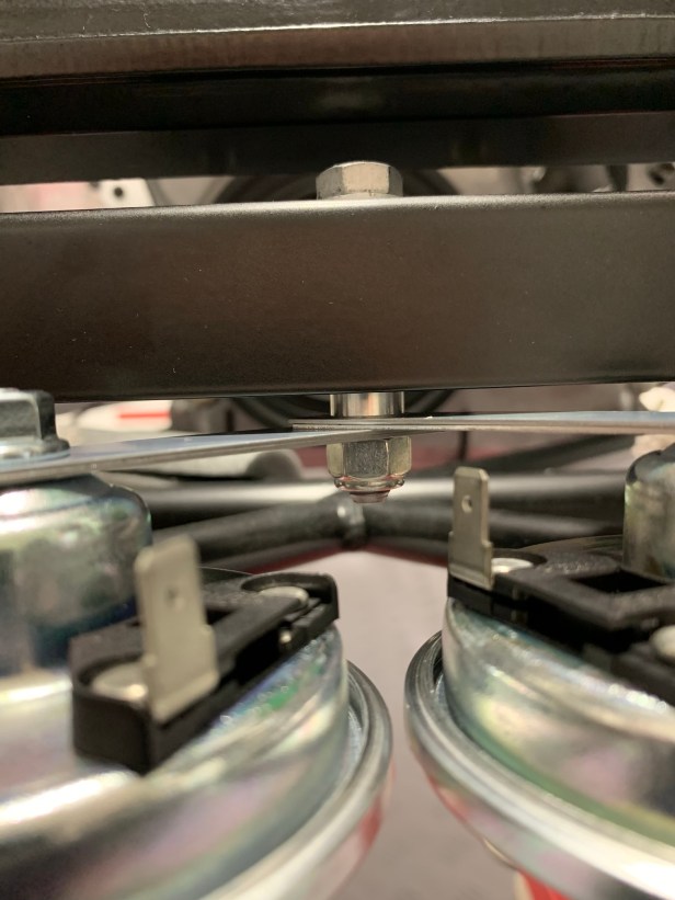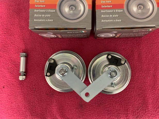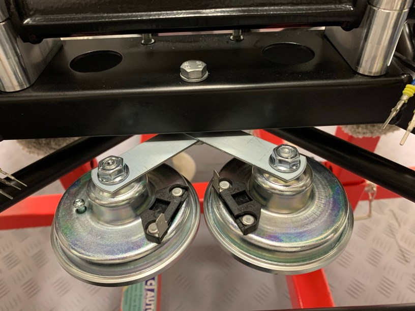 The horns as supplied will need to be rotated on the mounting brackets to get the connections as close as possible, because the wiring loom doesn’t have lots of slack. I held the horn mounting bracket in my workmate, and loosened the single nut holding the horn. Once the connections were as close as possible, I tightened the horn back onto the bracket.