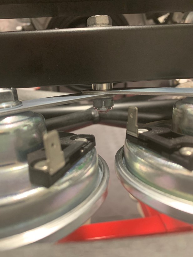 Next, it’s just a simple case of passing a bolt (with a washer) through the chassis steering rack platform hole, and then put the spacer, horns, washer and nut on the bolt.