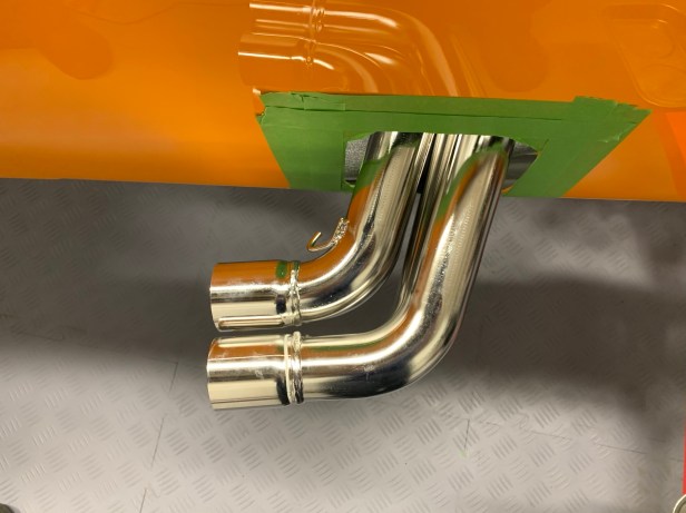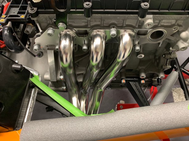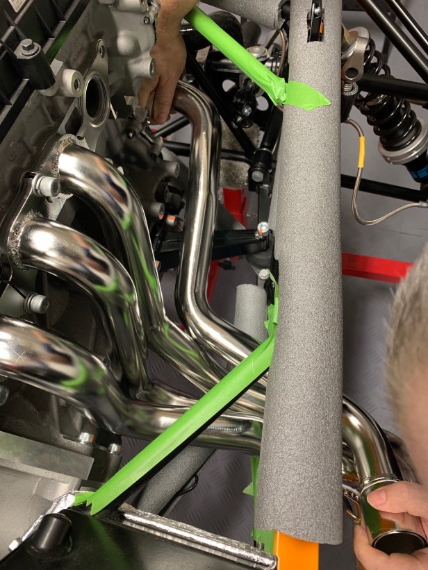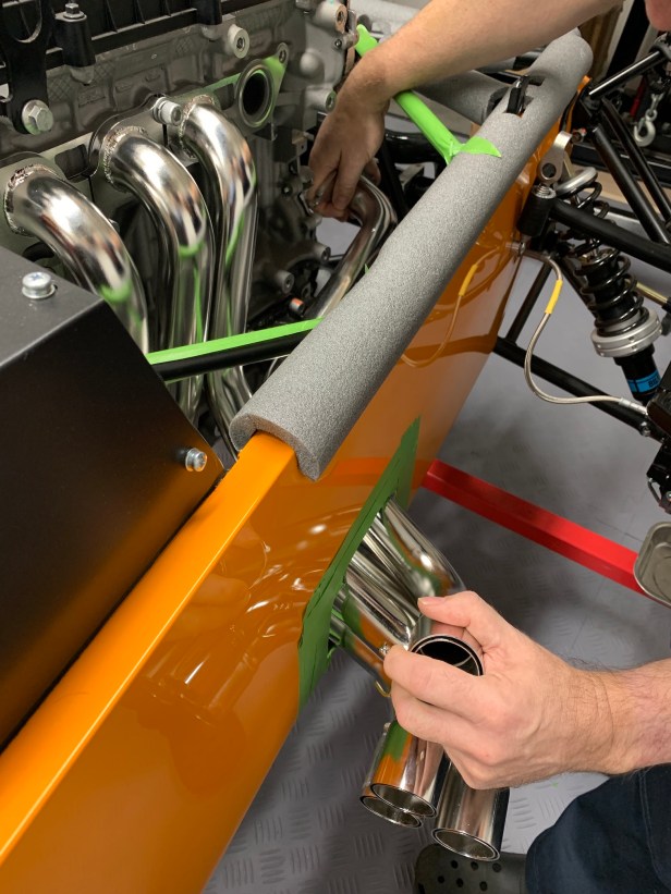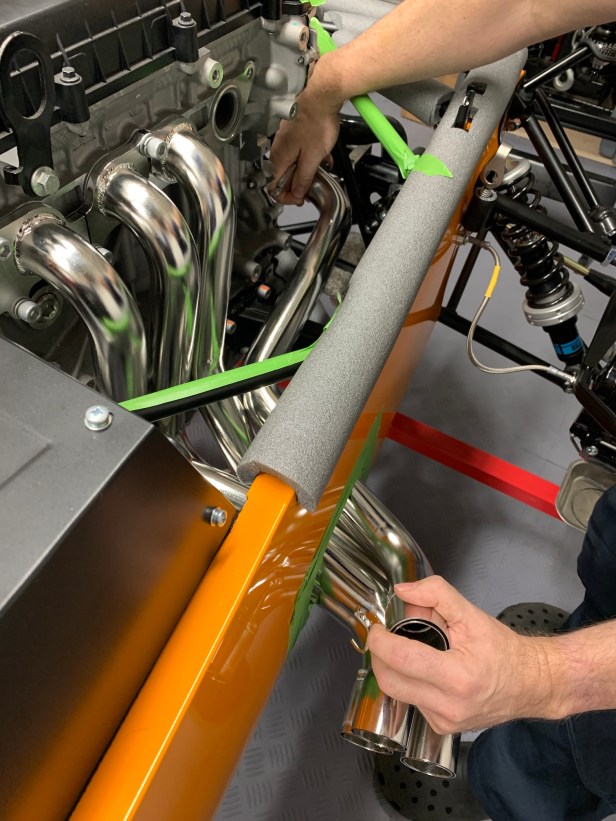In readiness I have protected the paint on the side skin and the chassis tubes. I also removed the manifold bolts and gasket (noting which way it goes). Once the protective tape was removed from the engine, I cleaned off the residue with the adhesive remover. Then reattached the gasket using the bolts for the front two primaries.