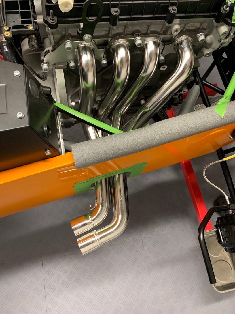 In readiness I have protected the paint on the side skin and the chassis tubes. I also removed the manifold bolts and gasket (noting which way it goes). Once the protective tape was removed from the engine, I cleaned off the residue with the adhesive remover. Then reattached the gasket using the bolts for the front two primaries.
