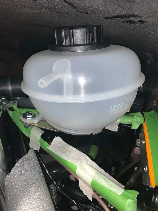 UPDATE – In v2.0 of the build manual, it shows the expansion tank bracket bolted to the non centred, non captive nut hole. This increase clearance with the nosecone.