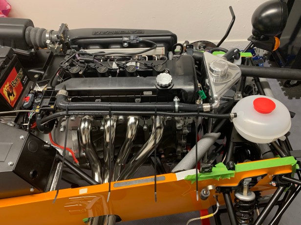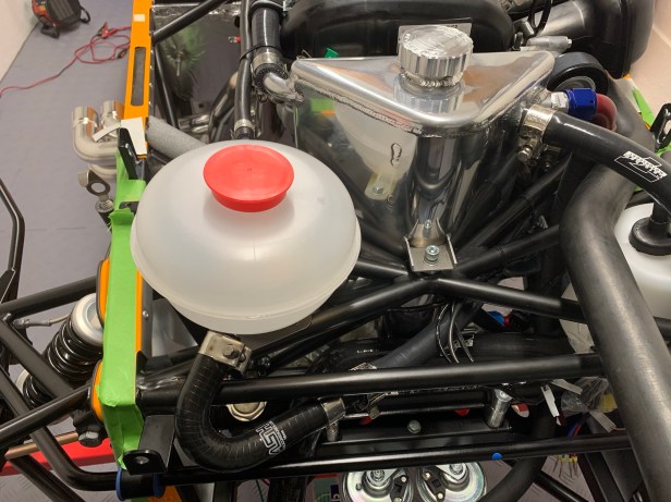 Next I had to make a choice: the S3 420R I have seen, had the main hose routed into the corner of the chassis. This resulted is a less than optimal route for the small hose near the cap. It was pointing directly at the dry sump tank. The alternative was to route the hose around the front chassis tube, in between the chassis and the front ARB. This results in a fantastic small hose route.