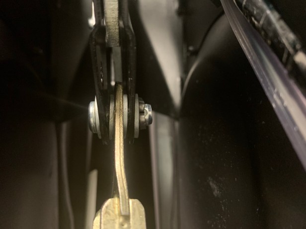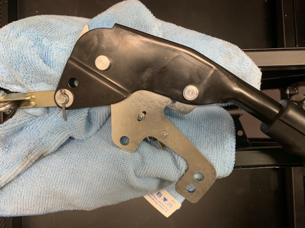 With the cable in position, I installed handbrake into the chassis. The new manual’s (v1.2 and v2.0) diagram shows the pin going through two washers, handbrake, clevis, handbrake and back through two washers. This was obviously not going to work, so I chose washer, handbrake, washer, clevis, washer, handbrake and finally another washer. Again, a bit of grease was applied.