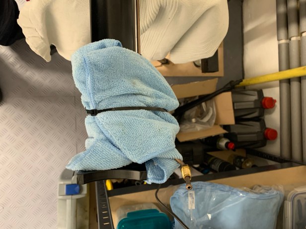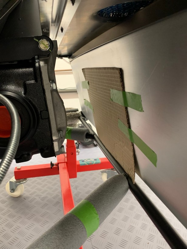 Before placing the de Dion tube into the chassis, I decided to put a little protection in place: a layer of cardboard on the fuel tank, some pipe lagging on the chassis tubes and a rag on the de Dion tube end I was going to feed through the chassis.