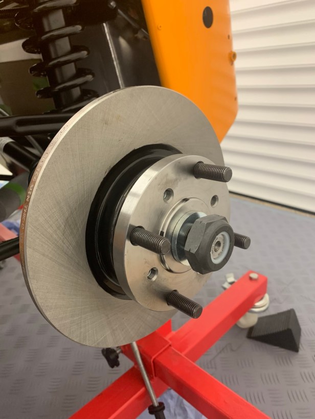Next the discs, hub nuts and washers, a task I have done a few times before. The plan is at this stage is only to tighten the hub nut, not to attempt the 270Nm torque figure. I will do that when I have working brakes / handbrake and the chassis is on the ground.
