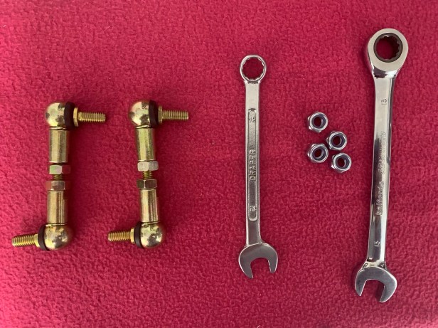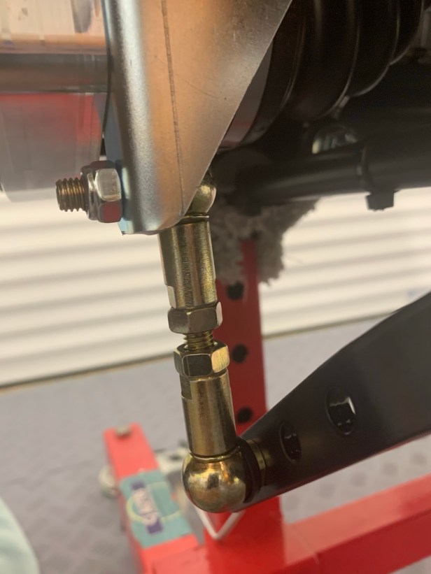 My final task was to fit the drop links for the anti roll bar. I prepared the drops links by removing the supplied plain nut from the ball at each end, and turned one end around so the balls point in opposite directions. Again, I needed a slim spanner, this time a 12mm. One thing to note is the old manual (2015c) shows a spacer / stand off fitted to the bracket. This was already replaced in my 360R build with the setup in the photo.