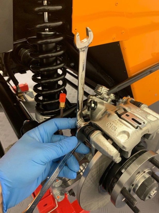 With the caliper fitted, it’s time to bend the brake line into the caliper on the right-hand-side. I used brake pipe bending pliers designed not to kink the brake line, but it’s possible by hand, just don’t kink the line. Once the brake lines are attached, I used a flare spanner to tighten them to the rear calipers.