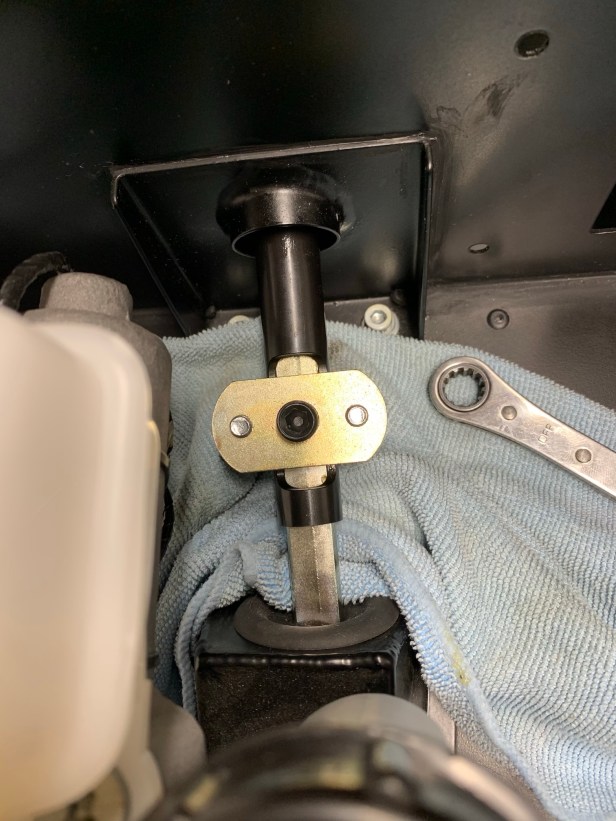 To gain a bit of access, I removed the steering UJ, and slid the lower column a little lower. The rag stopped any damage to the powder coat.