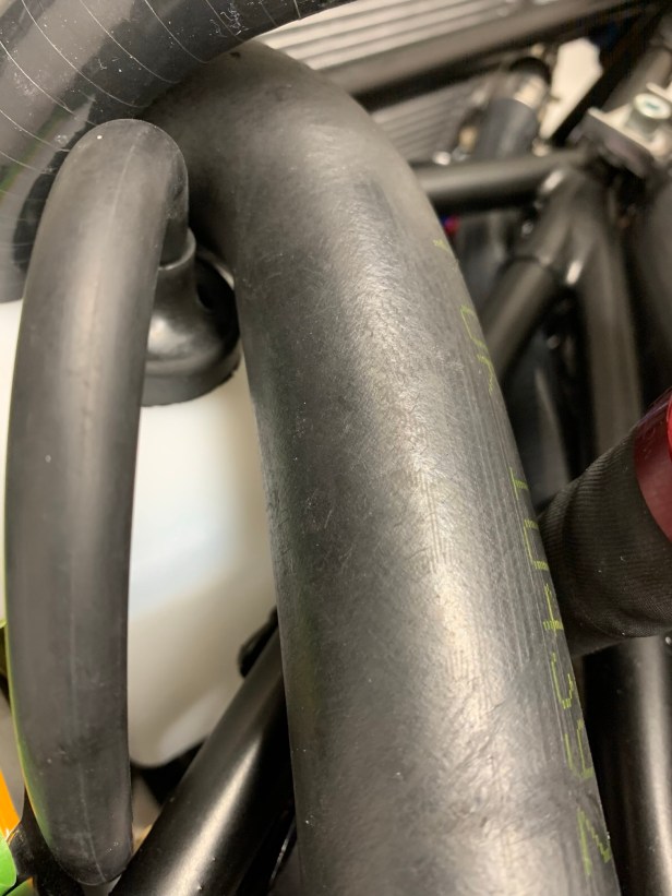 This flexibility meant the bend over the catch tank to the new 420 radiator entry location was much easier to achieve. This hose no longer applied strain to the radiator connection and I am much happier with the replacement than I was with the original hose. There was one down side though: the hose needed some trimming of both ends and that didn’t end well last time.