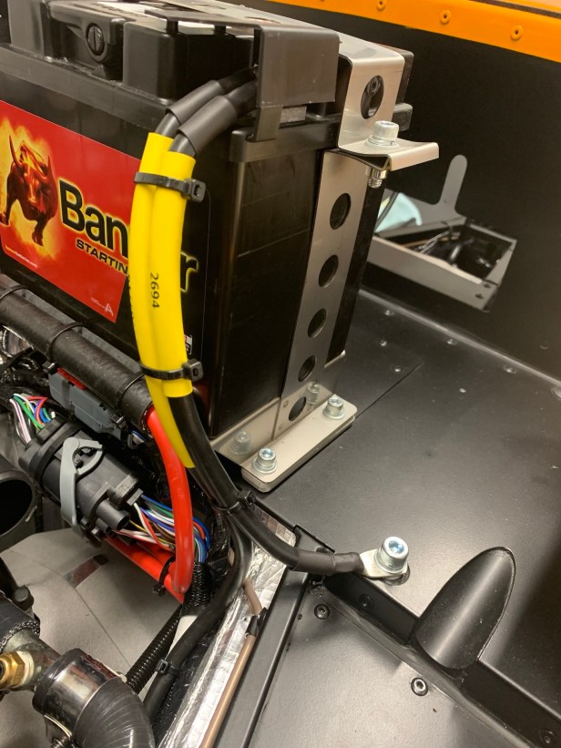With the plenum removed (again), I had the opportunity to finish off the one wiring element I had neglected so far, the earth straps. I connected one earth strap directly to the chassis, by fitting it to the earth strap hole. I added two washer under the earth strap for clearance, to avoid it touching the powder-coated aluminium skin. The other earth strap I fitted to the engine by removing one of the bellhousing-to-engine bolts. Both will be connected the the battery once I am ready to start the engine.