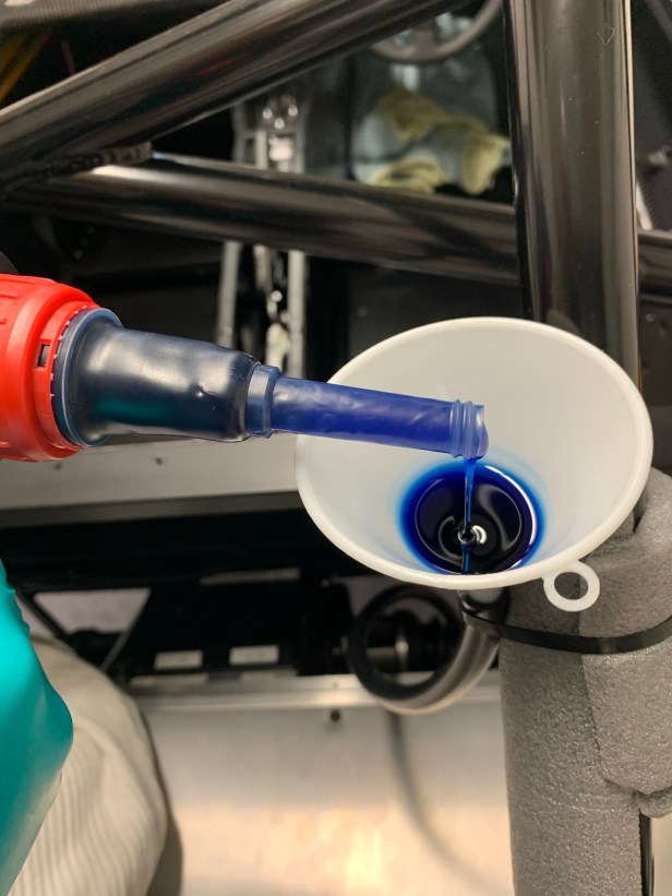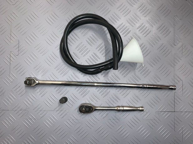 With the plug removed I could break out my high tech fill solution. I have a pump-action gearbox / diff oil filling bottle, but this isn’t needed when gravity can do the work for you.