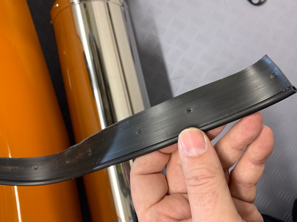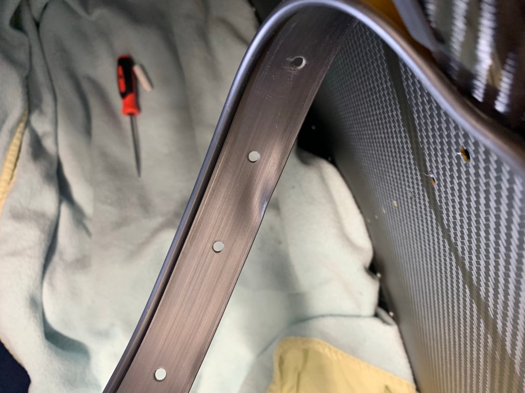 The piping that is already partial riveted to the chassis but it has a little excess that need to be trimmed off. I used a strong pair of scissors. Now the piping sits flat, I could mark the holes, to do this I used a strong pick, to punch through the hole. The holes are drilled into the chassis tube so there is no danger of punching through the the outer skin.