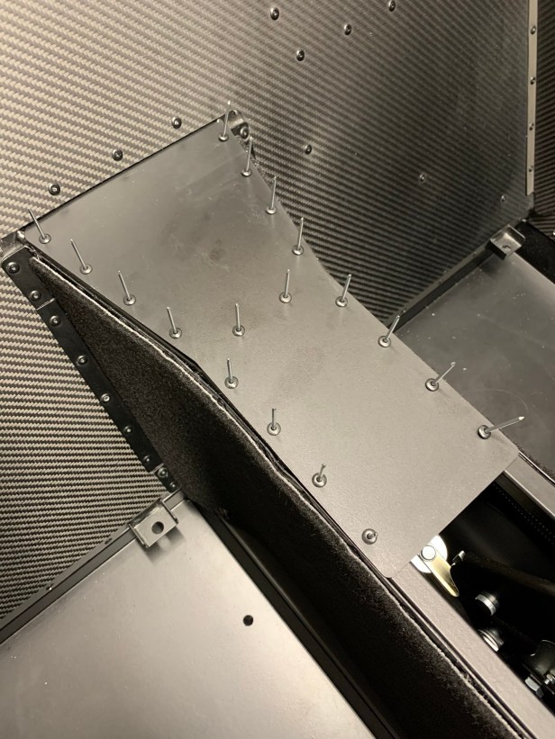 With the prop shaft bolts tightened and the knee panels fitted, I can now fit the tunnel cover panel, and finish off the side panel pop rivets. During my 360R build none of the side panel pop rivets where fitted, but it seems Caterham have now taken pity on the kit builder only leaving a handful still to fit.