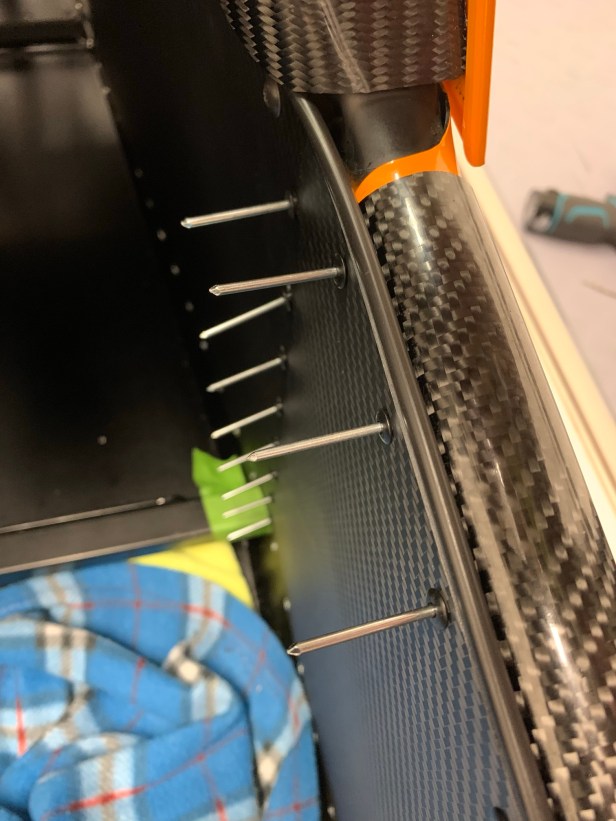 The tunnel panel was a simple panel to fit. I choose the side with the best finish, and made sure that side faced upwards. Then I put rivets in all the holes, ready to rivet.
