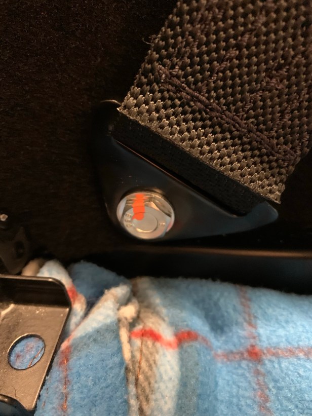 For each seat you need a red latch strap that’s attached to the tunnel, and a buckle strap attached to the side wall. My car has carbon interior side skin, which was unnerving as the bolt was tightened, but I can’t see any obvious damage. However, even if there was it’s more important to have a tight seat belt than worrying about damage which is hidden by the seat. The belts need to move freely, so it’s worth checking that they can be pulled into different positions.