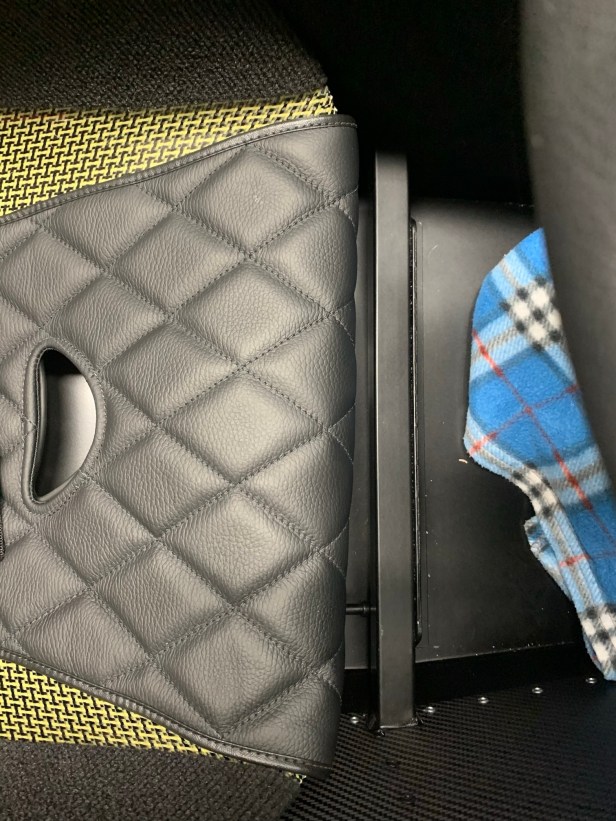 I then positioned the seat belt, one over the tunnel, and the other in easy reach. The seat belts have to be passed through the holes in the seat, as it is lowered into the chassis. I also placed a microfibre on the floor to make sliding the seat and locating the rear bolts easier.