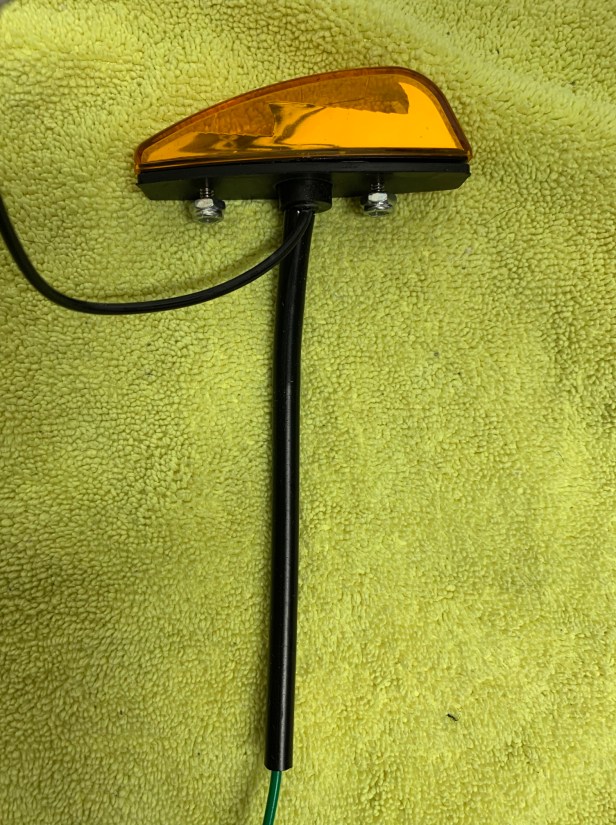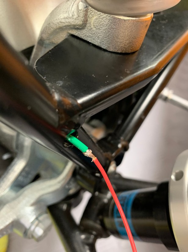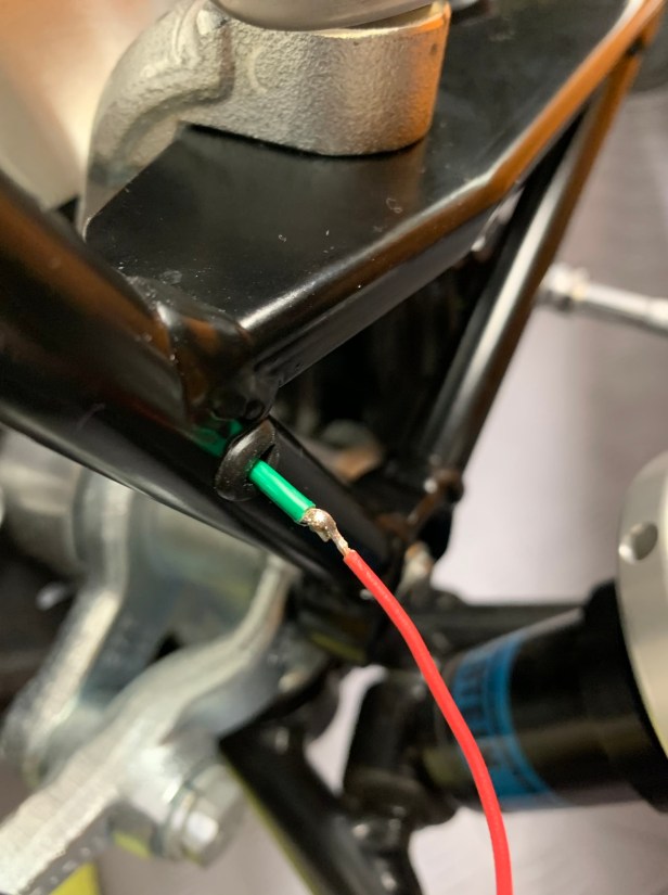 I then apply a little heat shrink to the green wire, for protection. Then I apply some 4mm internal diameter silicone hose (black for looks) over the green wire. This is to protect the green wire from rubbing on the earth connection, which is either a pop rivet or self tapping screw into the wing stay.