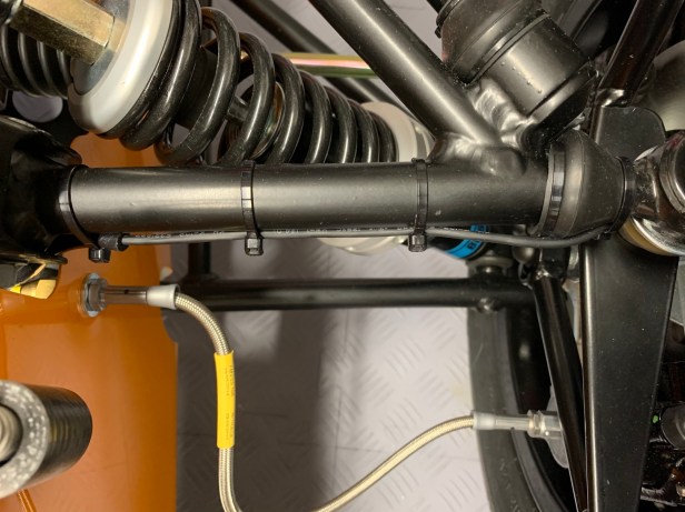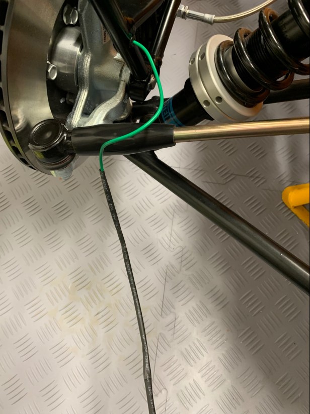 Now I heated the rest of the heat shrink ready for tie wrapping to the rear of the front upper wishbone. There is an IVA requirement for the wire to be protected as it enters the side skin of the car. The kit recommends using excess washer bottle hose (of which there is plenty), but this doesn’t produce the finish I am looking for, so I use some more 4mm internal diameter black silicone hose.