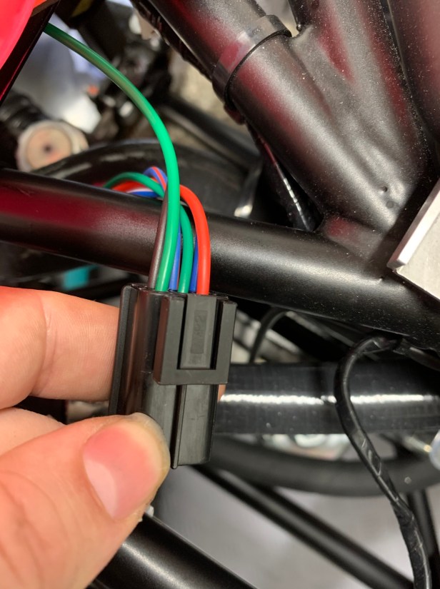 The green wire goes into the head light connection Econoseal, next to the other green wire for the front indicator, and finally I could install the yellow plastic locking insert, and call the headlight connections done.
