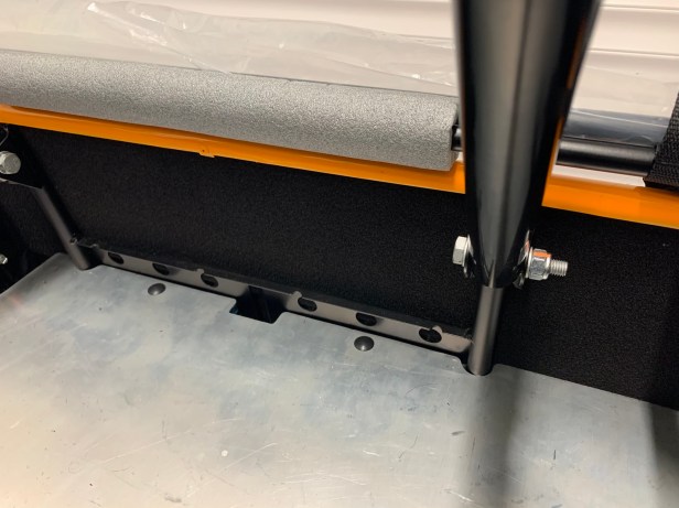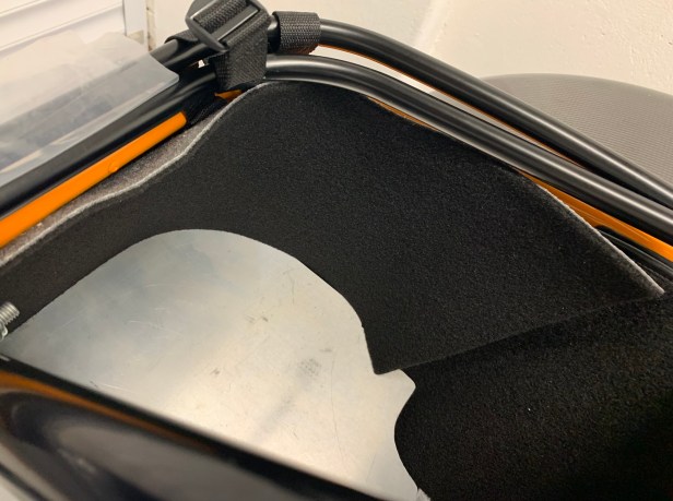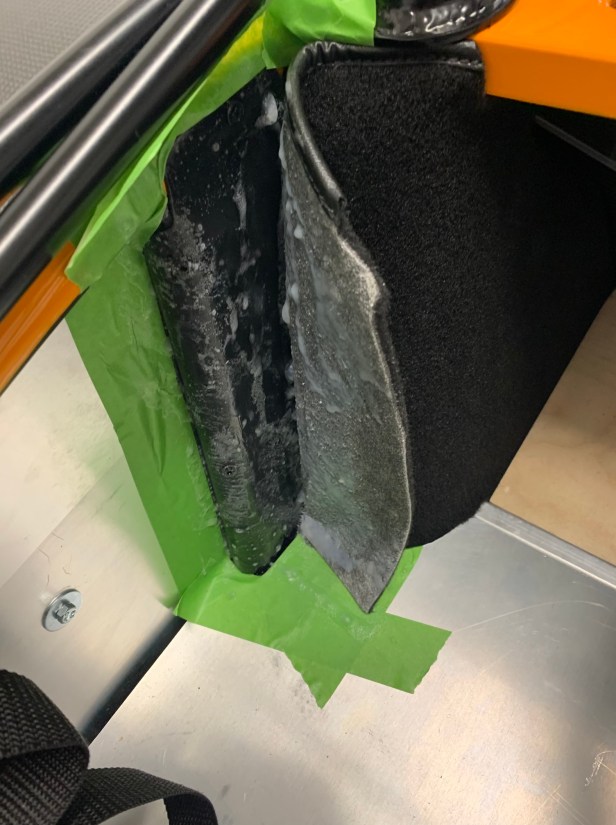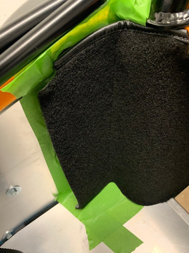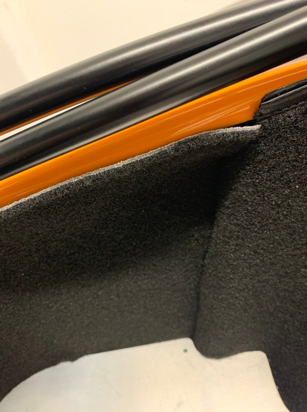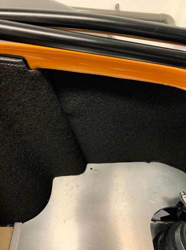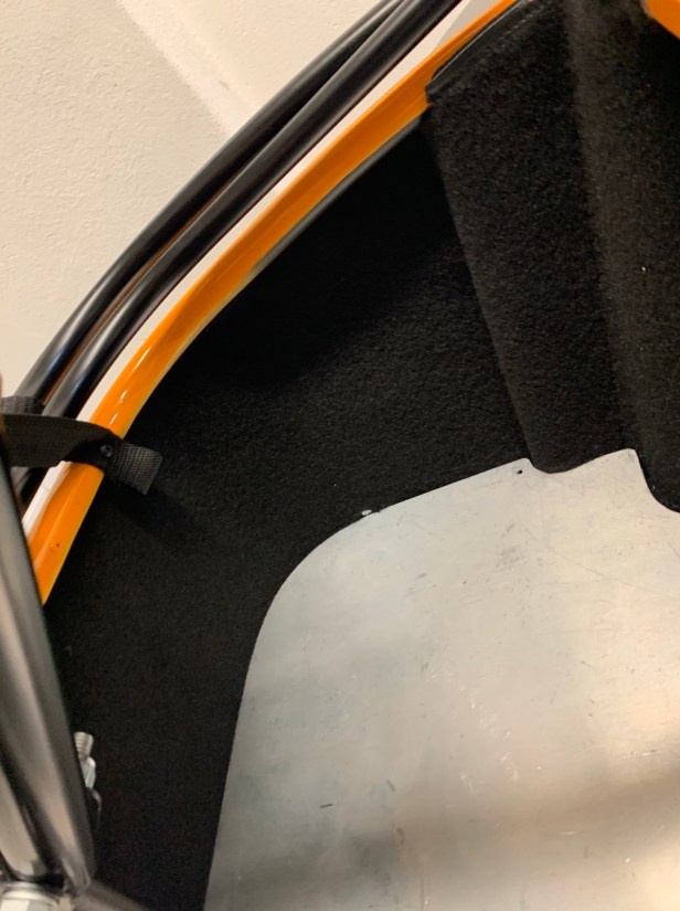 The first carpet part I am fitting is the section that covers the rear shock panel. This isn’t a straight forward panel to fit carpet to, because it bends around two curves. This carpet panel needed a little trimming to get the fit I wanted. The main part I wanted to line up was the stitched edge at the top, as it curves under the roll bar.