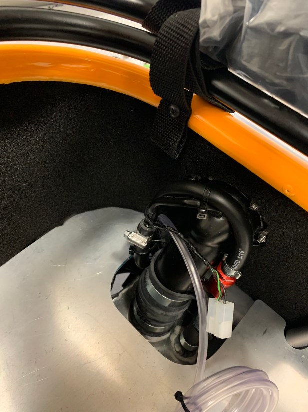 The carpet behind the fuel filler, although needing as much trimming as the other side, didn’t need any glue, because it’s going to be held with the fuel filler cover and the washer bottle. I did however mark and punch out holes in the carpet for the rear wing fixings, because I am using them for the washer bottle.