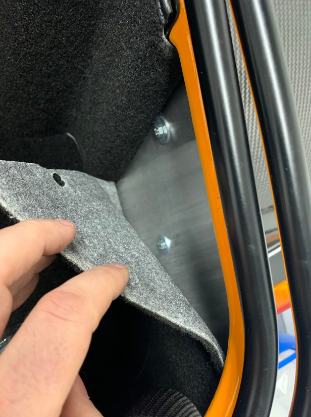 I remember the poor fit my 360R fuel filler cover had with the boot floor and the top chassis rail, something that had to be left to post build check, where the part was replaced due to a sizing problem. I was also expecting to have to put some IVA trim on the top of the fuel filler cover, but my fuel filler cover was a very tight fit, so tight in fact that it would not fit under the chassis rail if it was fitted on top of the carpet, so it had to be fitted under the carpet.