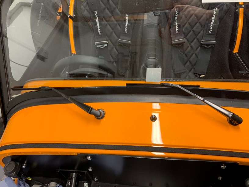 The next part of the process is to make sure that the wiper motor is parked, and to check which direct it’s going. Caterham actually have the wipers going the wrong way, they sweep towards the passenger. I checked the wipers were parked and the direction on travel several times, before committing to press the wiper arms onto the spindles. The arms should rest just above the windscreen frame. The wiper blades are also just a press-fit to the wiper arms. If you do get the arm in the wrong place, lever it off very carefully (with a plastic trim lever if you have one), because it’s very easy to slip and damage paint.