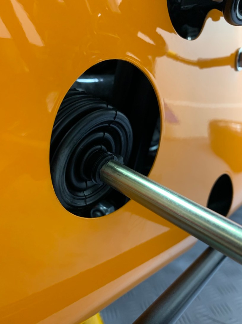 I applied plenty of masking tape to protect the paint, and slowly enlarged the hole so the steering rack gaiter no longer touched the side skin when going from lock to lock. Although the problem area was only at the 7 o’clock position, the enlargement was from 4 o’clock to 10 o’clock to maintain the shape. I used a dremel and finished off with sandpaper to create a neat finish. Releasing the tie rod from the upright gave me more room to make the enlargement.
