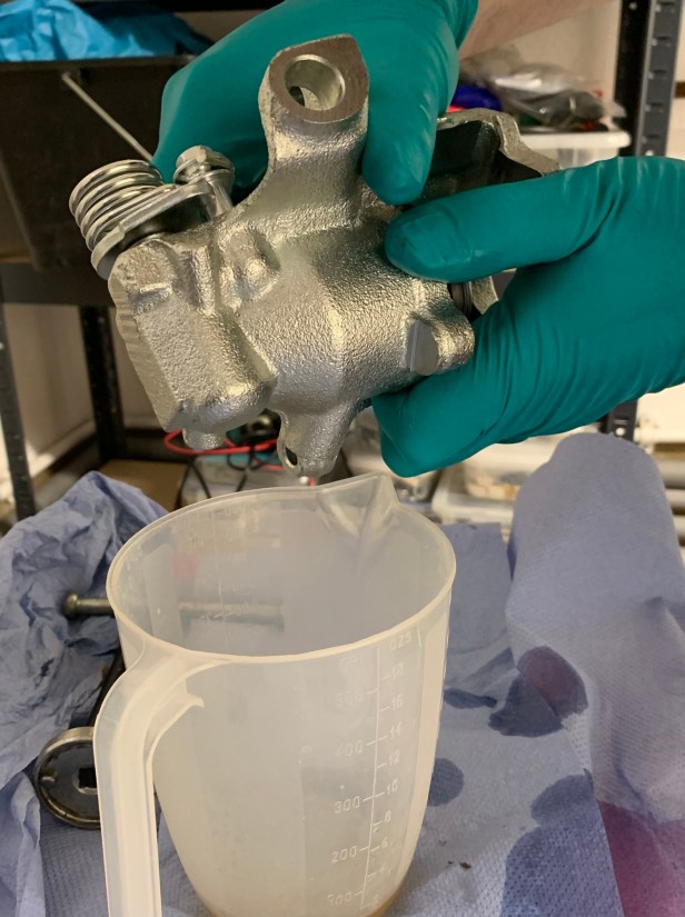 Just as I finished the bleed on the left-hand side rear caliper, I noticed my right-hand side caliper had a puddle on the floor.