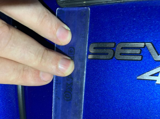 My Caterham does not have stripes, so I was expecting an easy job – clean and stick – but the holes drilled where too small for the badge. The holes measured 4mm in diameter, but 5.5mm is actually needed for clearance. Obviously, having got to this stage of the build, getting the drill out wasn’t going to scare me, so the holes were soon enlarged, smoothed with a rats tail file and the nose badge fitted at last.