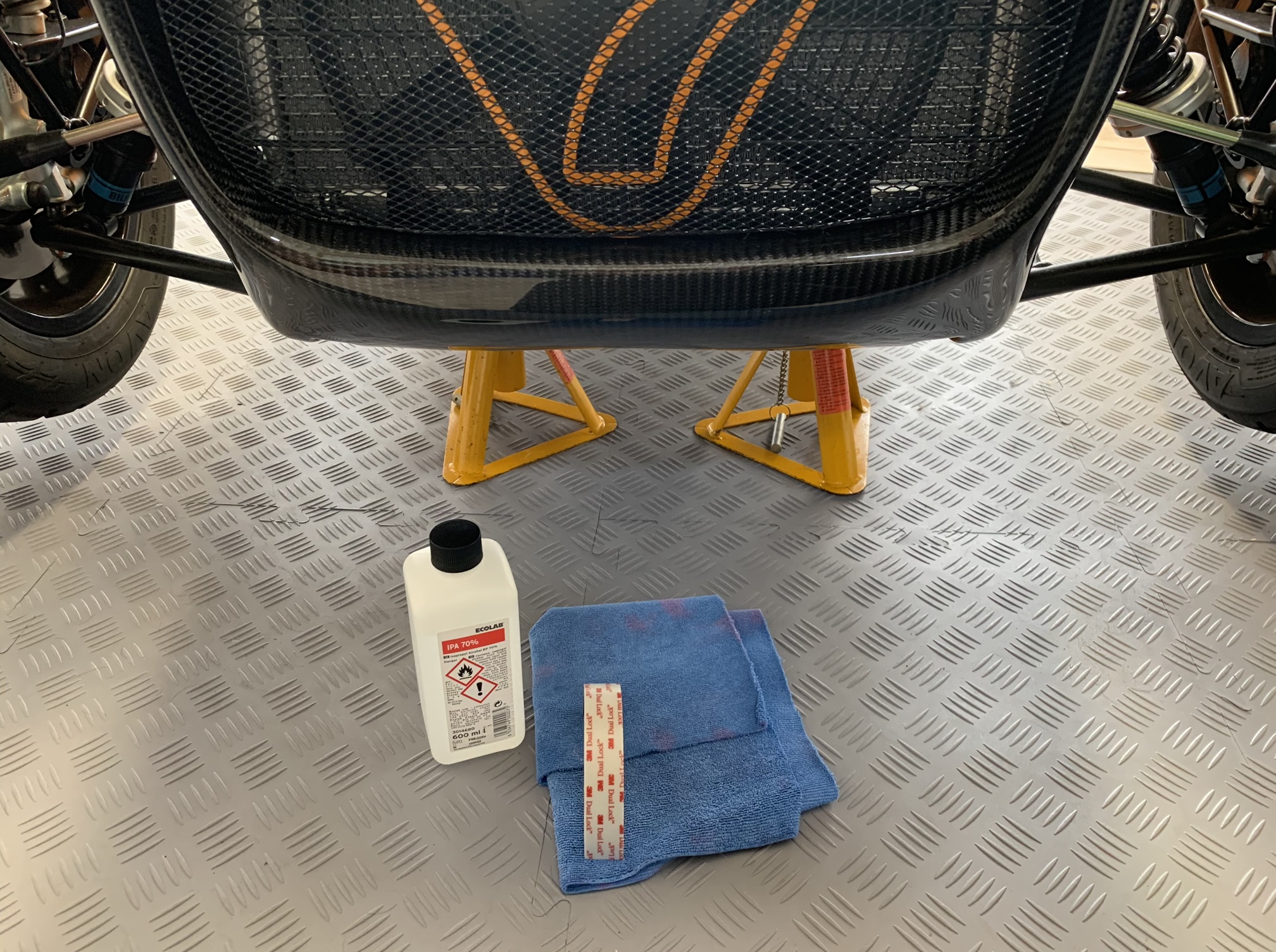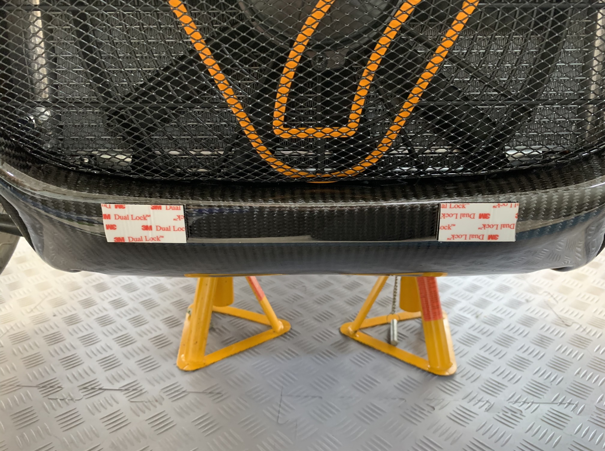 Before I stuck anything, I cleaned the surface of the nosecone and number plate with a quick wipe of IPA alcohol. I then stuck the 3M Dual Lock pads to the nosecone. I centred the number plate using the 7 grill and a measured mark on the number plate. To level the number plate, I used masking tape to create a reference line. As a final step, I removed the backing from the 3M Dual Lock pads and secured the plate using my reference mark and masking tape line.