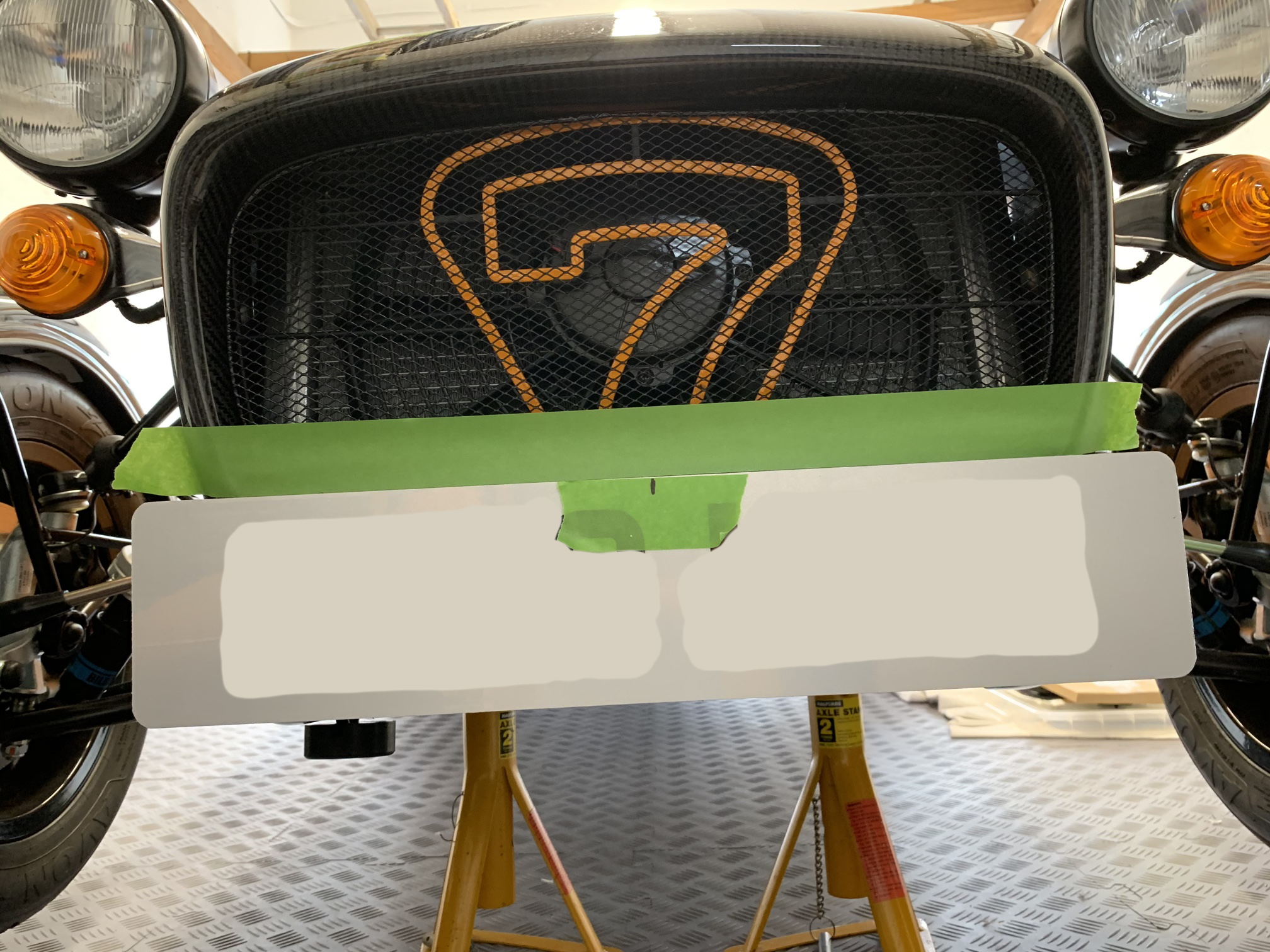 I centreD and levelled the rear number plate, but left it hinged with masking tape. Once I was happy with the position, I lifted the number plate up, removed the backing of the double sided tape and hinged the number plate back down.