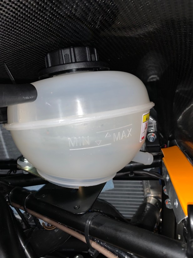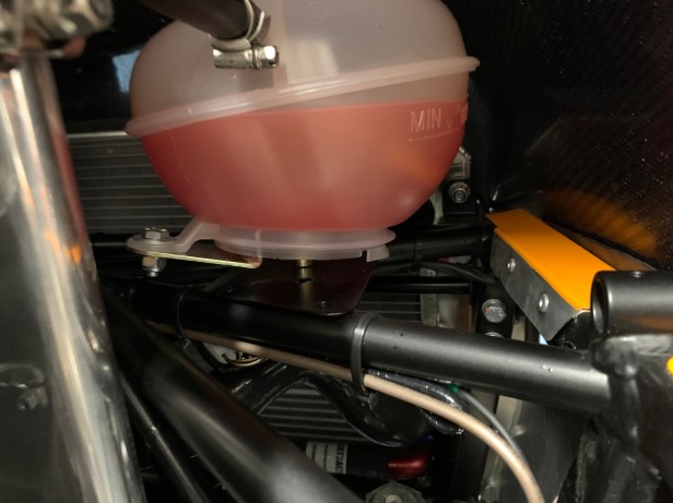 Refitting the expansion tank and nosecone to ensure the gap had increased, I realised I could increase the gap even further by fitting a small spacer between mounting bracket and the expansion tank. This did require a slightly longer bolt.