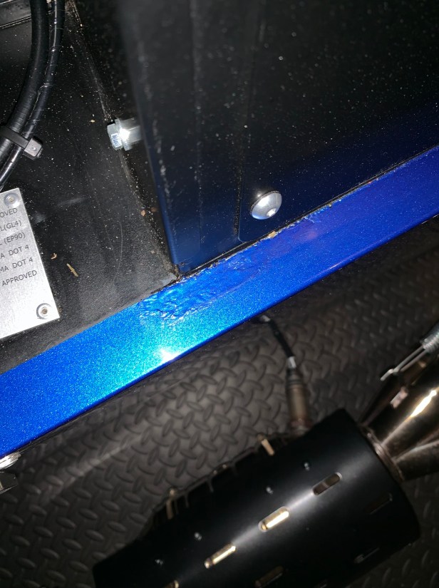 As you can see from the photos, my 360R suffered a leak from the brake fluid cap, and the paint was damaged as a result. Therefore, even with race cap fitted, a rolled up shop towel is secured as a first line of defence against any potential leak.
